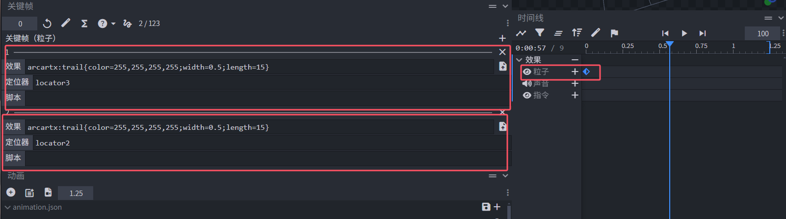 模型篇模型特效帧模型拖尾效果通过定位器生成拖尾特效模型拖尾效果 拖尾效果适用于投掷物或动作的拖尾场景: 使用方式 通过定位器配合动画指令帧实现: arcartx:trail{color=255,255,255,255;width=0.5;length=15} 参数类型说明colorRGBA颜色值,格式为 R,G,B,Awidthfloat拖尾宽度lengthint拖尾长度Previous模型音频帧Next模型刀光效果
