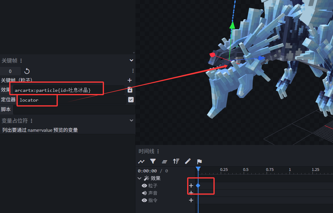 基岩粒子效果可以在模型的定位器(Locator)位置播放基岩版粒子。粒子会跟随定位器的位置和旋转,实现精确的特效绑定。